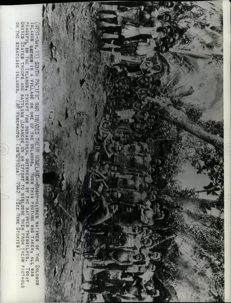 Haired natives of the Solomon Islands gather in a village on one of the Islands.