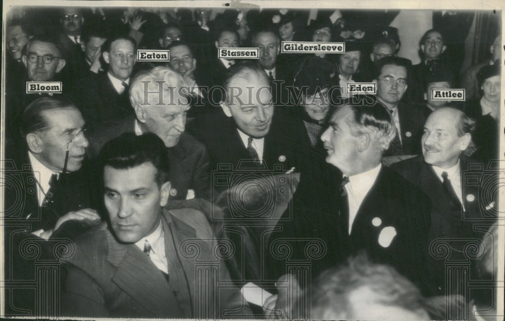 San Francisco: Great Britain’s Foreign Secretary Anthony Eden turns to talk to U.S. Delegates at the United Nations Security Conference here today. Left to right: Rep. Sol Bloom (D-NY), Rep. C. A. Eaton (R-NJ), Cmdr. Harold Stassen, Dean Virginia Gildersl