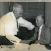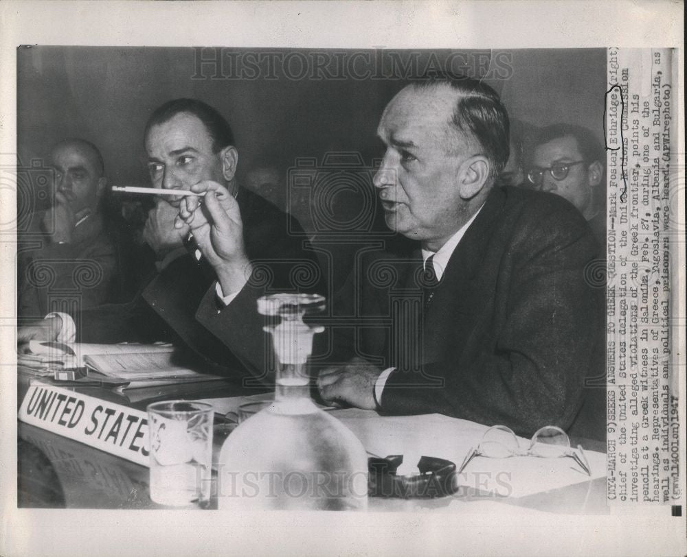 Caption: March 9 – Seeks Answers to Greek Question – Mark Foster Ethridge, (right) chief of the United States delegation of the United Nations Commission investigating alleged violations of the Greek frontier, points his pencil at a Greek witness in Salonika, Feb. 27, during one of the hearings. Representatives of Greece, Yugoslavia, Albania and Bulgaria, as well as innaviduals and political prisoners were heard.