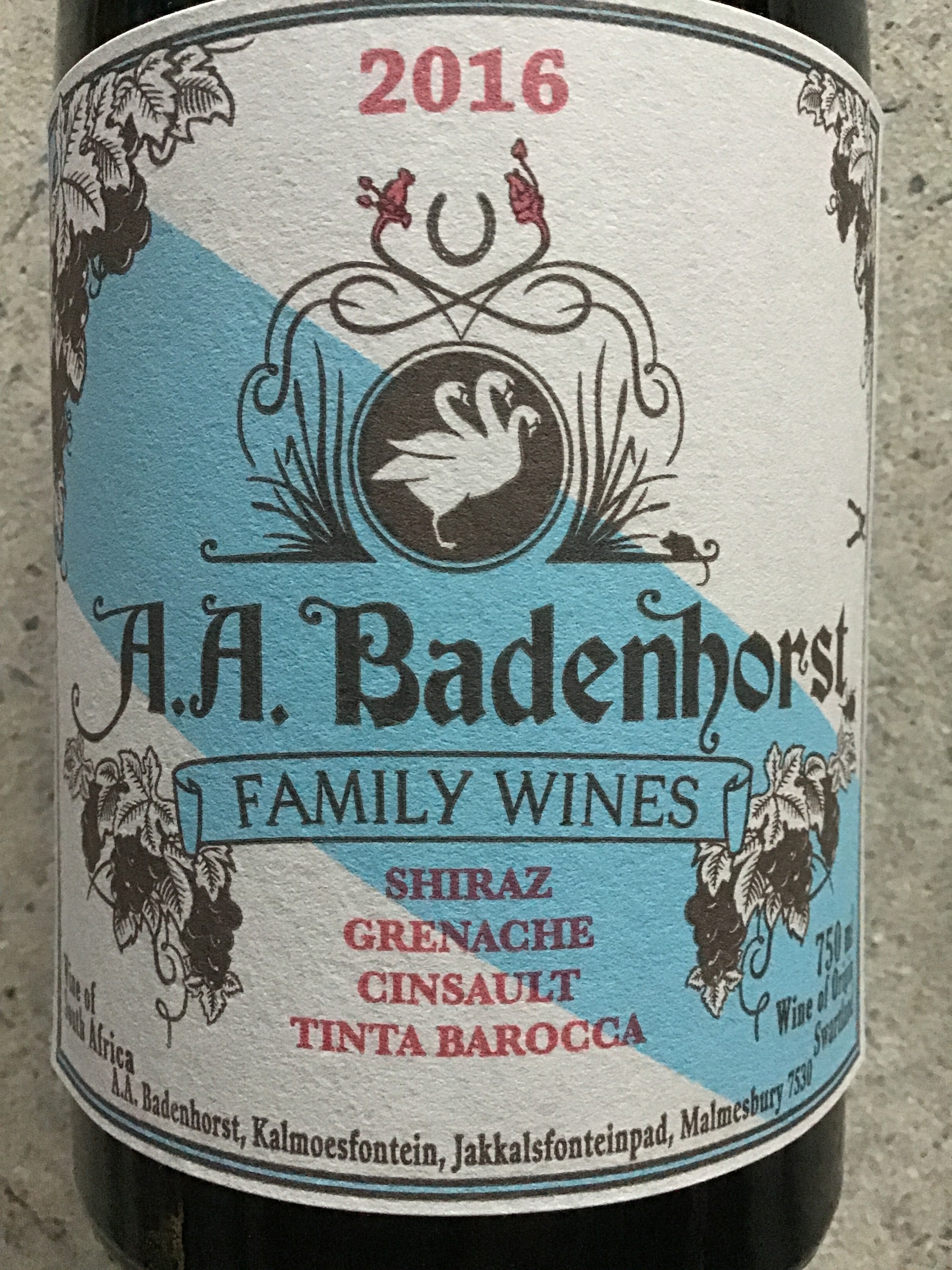 56% Shiraz, 19% Grenache, 12.5% Cinsault, 12.5% Tinta Barocca