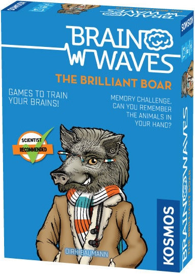 In Brainwaves: The Brilliant Boar, each player takes cards showing different animal portraits on their reverse sides into their hand. They can look at the cards briefly when they draw them, but then must face the cards away from them. On a players turn, they can either take the top card from the deck into their hand or play one of their cards onto the table, attempting to make as many pairs as possible from the card just played and those already face up on the table. Whoever collects the most cards wins.