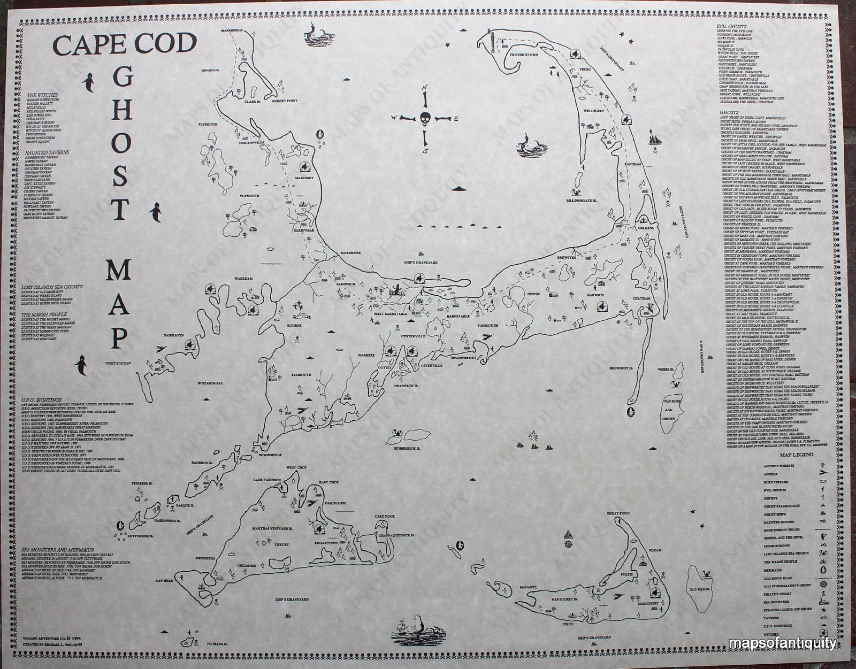 Entertaining and unique, this popular hand drawn old-style map print shows Evil & Friendly Ghosts, Witches, Haunted Taverns, UFO Sightings, Sea Monsters & Mermaids, 20 1/2″h x 26 1/2″w. Can be purchased as $35 black & white rolled poster (REP031BW); $75.00 for hand colored piece (REP031); or $215.00 with simple gold or black wooden custom frame and plexi for shipping (FRAREP031). A wide assortment of custom frames are also available at additional cost. Please note that additional shipping charge for framed piece applies. This listing is for the uncolored, unframed version.
