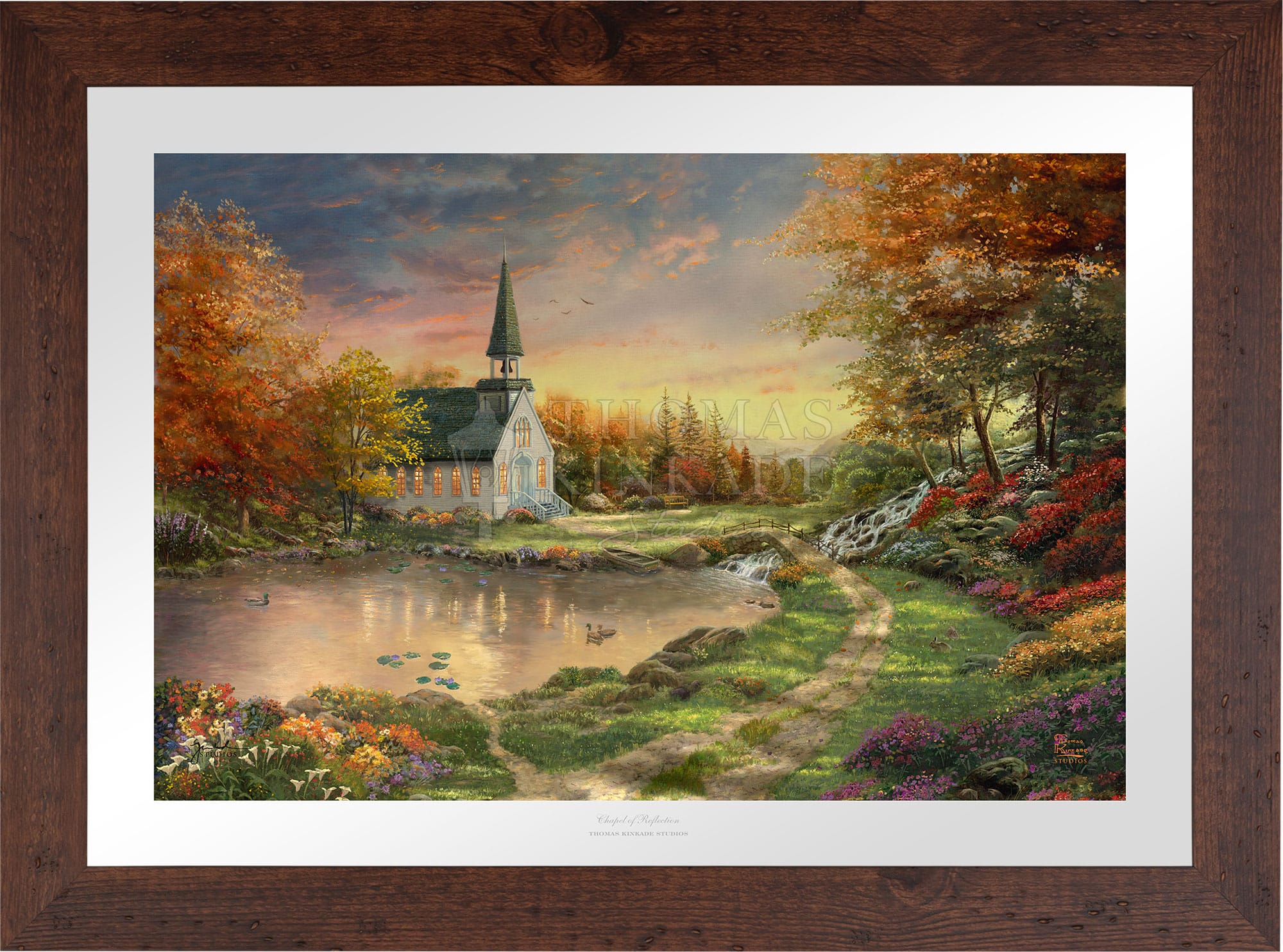 Thomas Kinkade Studios is pleased to present Chapel of Reflection. Carrying on in Thom’s tradition, the Studios created this artwork, portraying a church set in a gorgeous fall landscape to illustrate the hope and beauty that we find in God’s natural presence. The afternoon light casts a soft glow in the sky, as the forest is set alight in autumnal colors. The chapel’s reflection is mirrored in the gentle movement of the water. This painting reminds us that no matter how dark the night, the day will dawn, renewing nature’s tender mercies and rewarding the hopes of the faithful.
