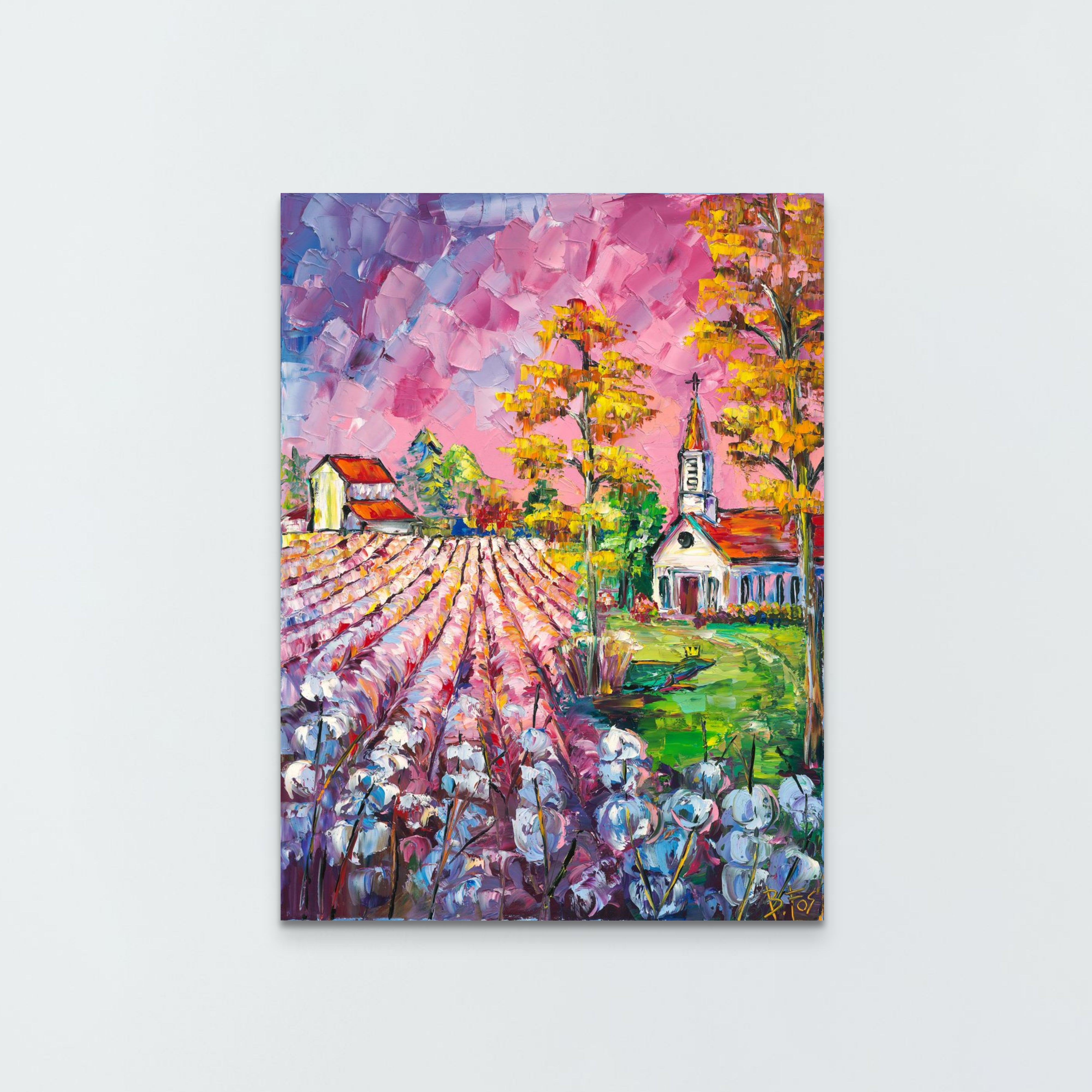 “Cotton Country” captures the essence of one of Louisiana’s most iconic landscapes. Portrayed in cool tones with a cotton candy sky that is sure to transport the viewer into the technicolor world of Becky Fos.