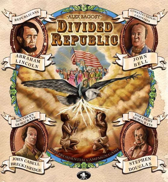 Divided Republic is a card driven two to four player game representing the last calm before the storm that was to become the American Civil War. Players represent the four major parties (Constitutional Unionists, Northern Democrats, Republicans, and Southern Democrats) and attempt to win the presidency by defeating their opponents with dirty tricks, platform speeches, and the manipulation of key historical events. All the while, President Buchanan interferes, radicals riot, and the country continues the downward spiral toward civil war. If one party wins the election by achieving the necessary 152+ electoral votes, or wins in the case of an electoral tie thrown to the US Congress, history may well change. Nevertheless, there is always the chance that the population of South Carolina will finally explode into open rebellion and secede, ending the game, at which point everyone loses!