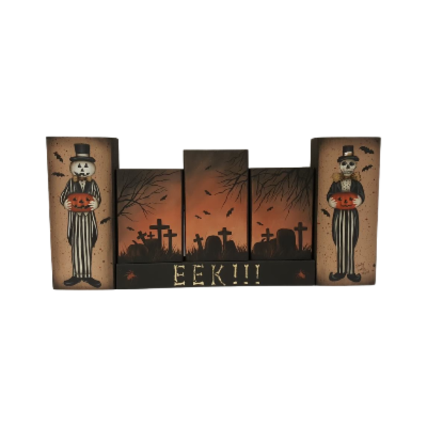 SUPPLIES: 2×4 wood blocks (2 at 8”) (2 at 5”) (1 at 6”) 2×2 wood piece 10” long Bat stencils (optional) Gold leaf (optional)
