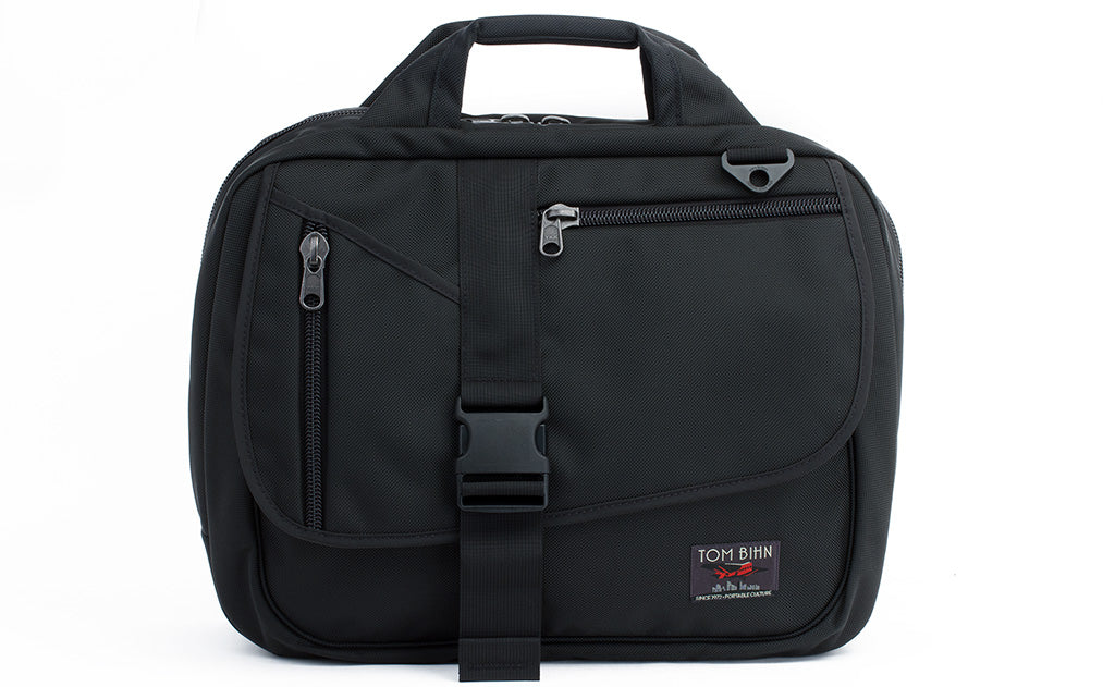 The asymmetrical front flap of the Empire Builder closes with a strong 2″ side-release buckle and has three pockets: a horizontal zippered pocket to fit power supplies or small electronics; a vertical zippered pocket designed to store an iPhone for quick access; and a diagonal, open-top pocket for a plane ticket or any similarly sized items you might need quick access to.