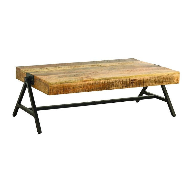 The Estonian coffee table features a thick slab of natural mango wood in a rectangular shape. The A-frame base is made from iron, and tapers to support the wood at a central point on each side of the table.