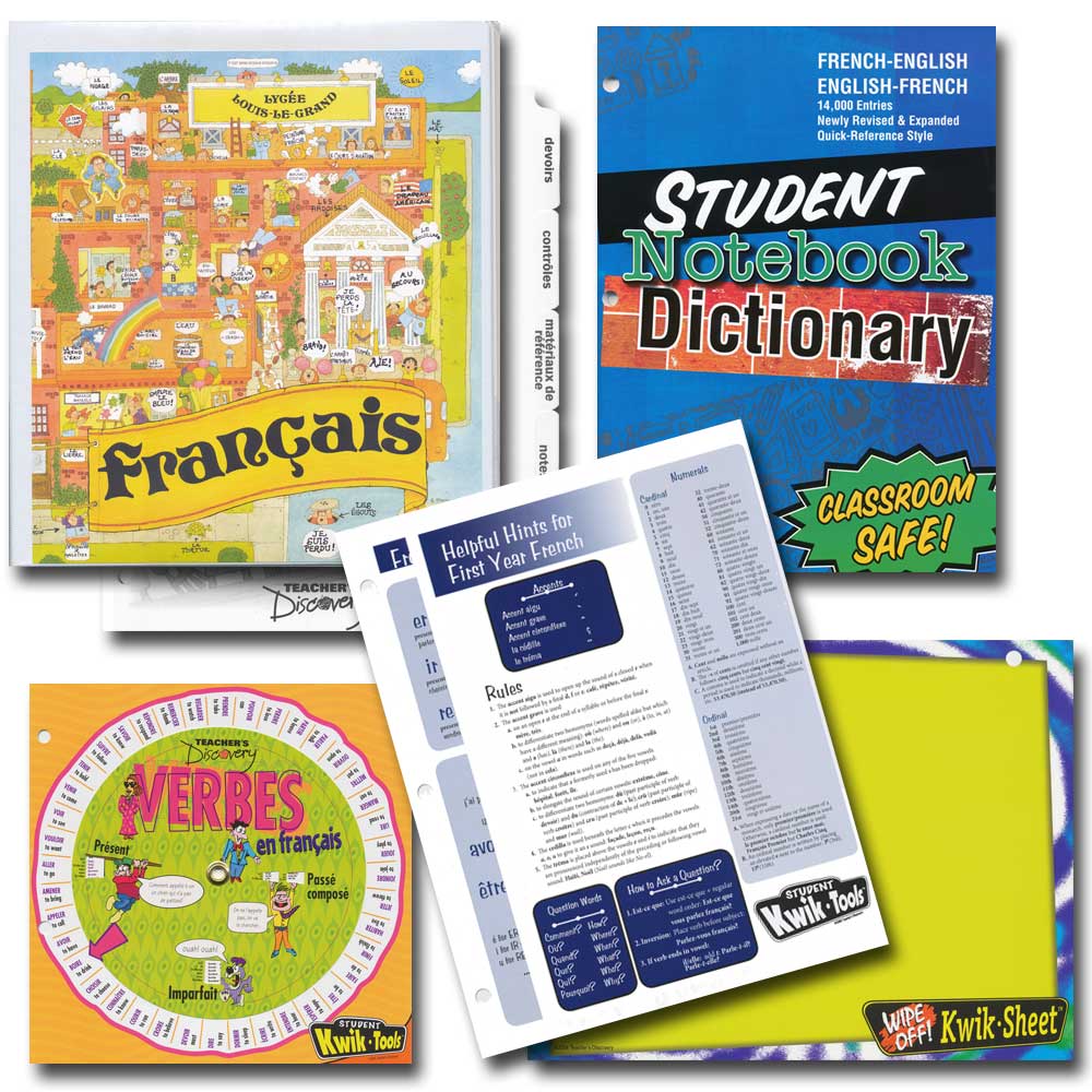 Have students supply their own binders! We supply everything else. Includes: Kwik™ sheet, grammar card, verb wheel, 32-page notebook dictionary, five navider tabs.