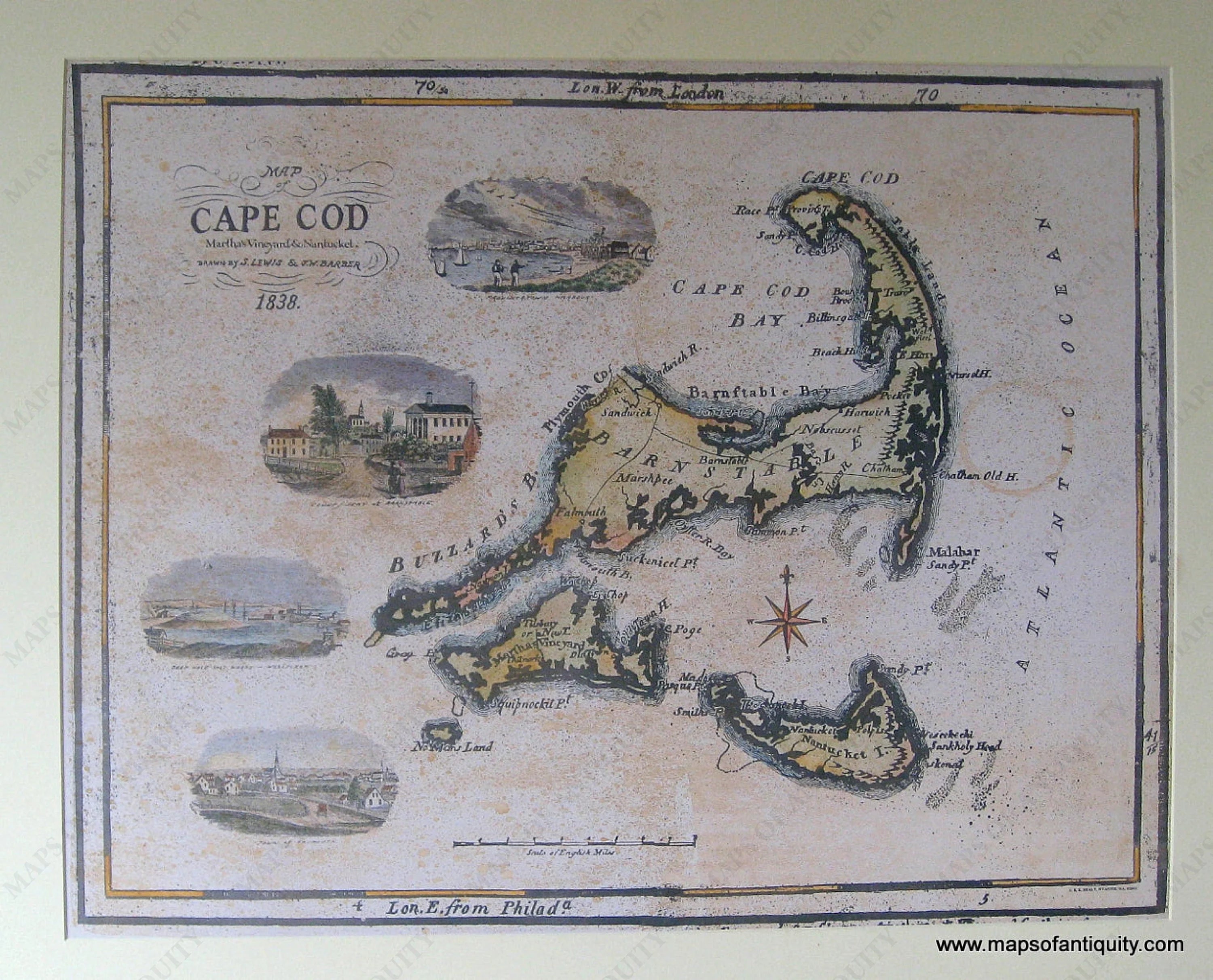 Color printed reproduction of a portion of the S. Lewis map of Massachusetts, showing Cape Cod, Martha’s Vineyard and Nantucket, with illustrations of Wellfleet, Barnstable, Provincetown, and Falmouth. Dry mounted and matted, 23 x 29.5 inches. In store pick up only. We currently do not ship large unframed dry mounted pieces.
