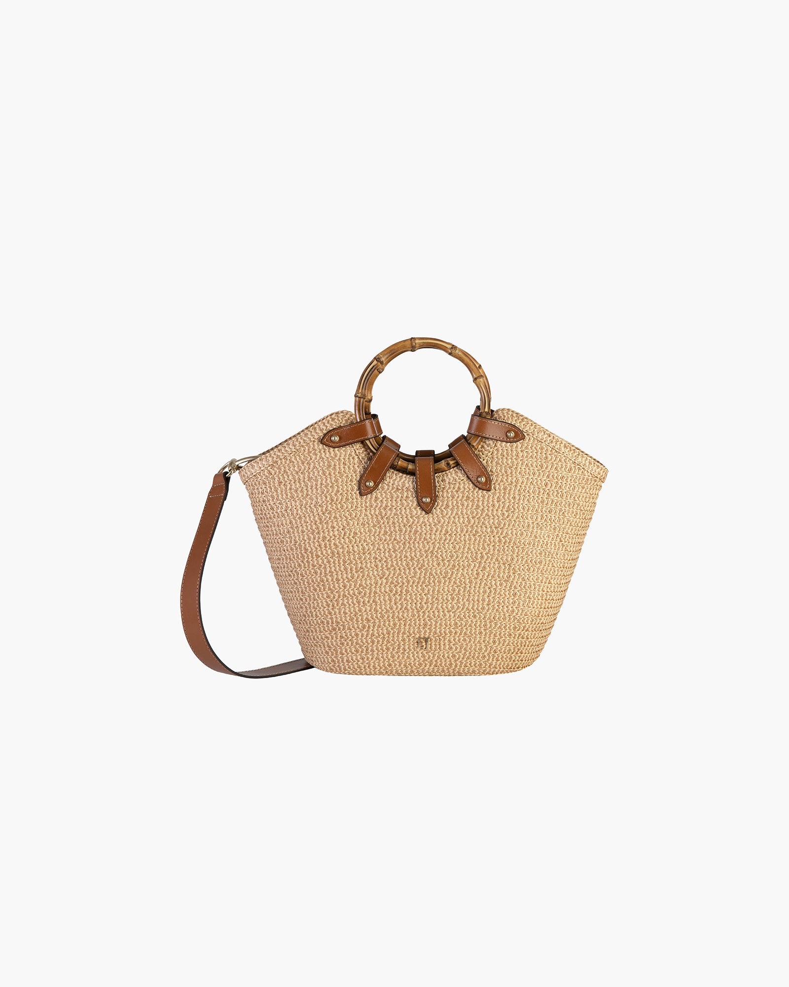 This elegant boat-shaped mid-size bucket tote of Squishee®, features dual bamboo ring short handles, a drawstring pouch top closure, and a detachable leather strap which adjusts easily from shoulder to cross-body length. Other features include protective bottom feet and a large outer patch pocket for easy access to phone, sunglasses and passport.