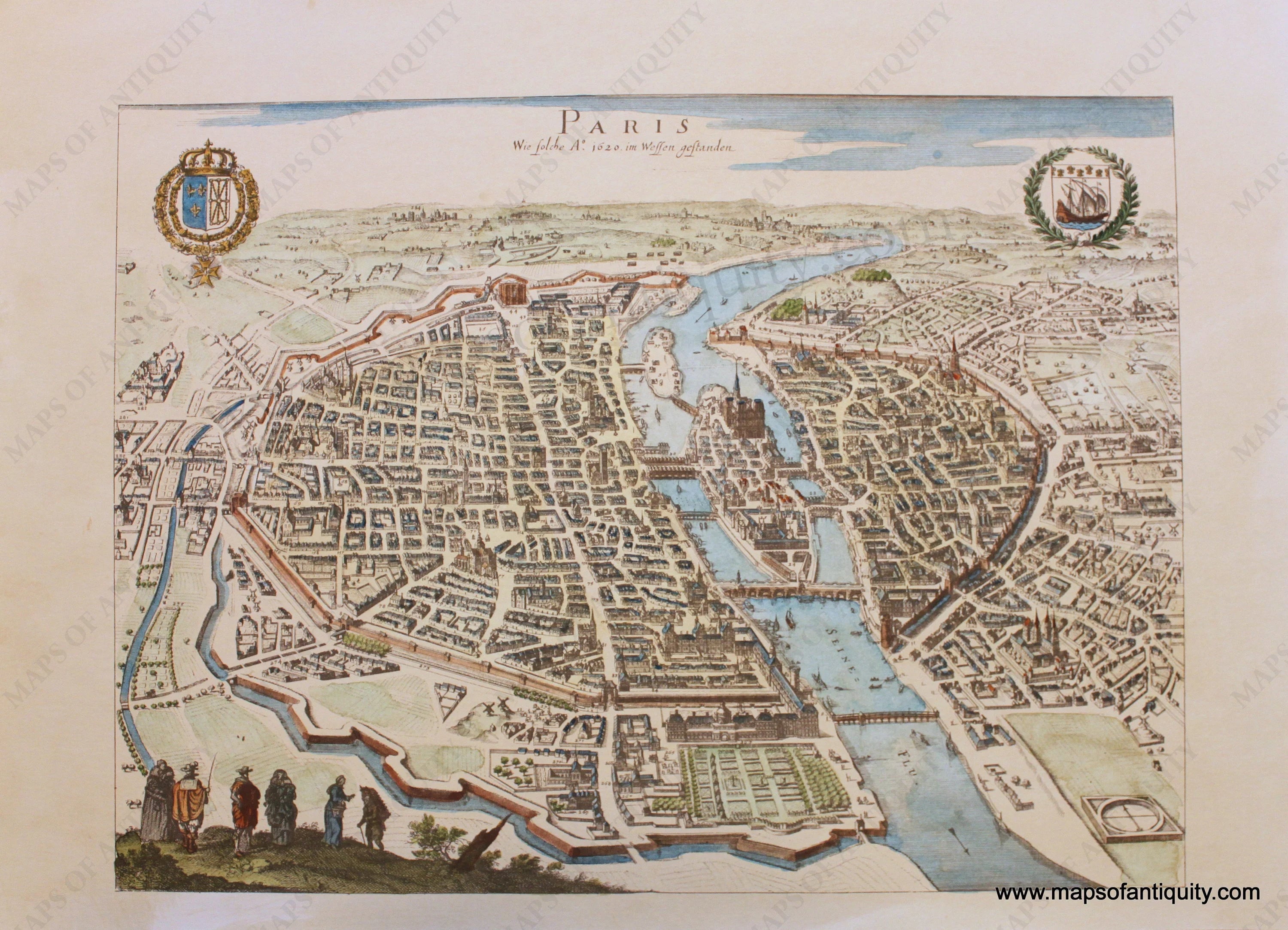 High-quality hand-printed and hand colored reproduction of a map of Paris by Matthaus Merian, published in 1655. Made using a combination of modern technology and traditional methods, wherein an original is scanned, its likeness is digitally etched onto an engraving plate, then the plate is used to print the image in the traditional way, with a printing press, onto paper. The print is then hand colored. Entire page measures approximately 16″ x 22.25″. For other reproductions made in this method, please see the left side bar category “Digitally Engraved Specialty Reproductions”.