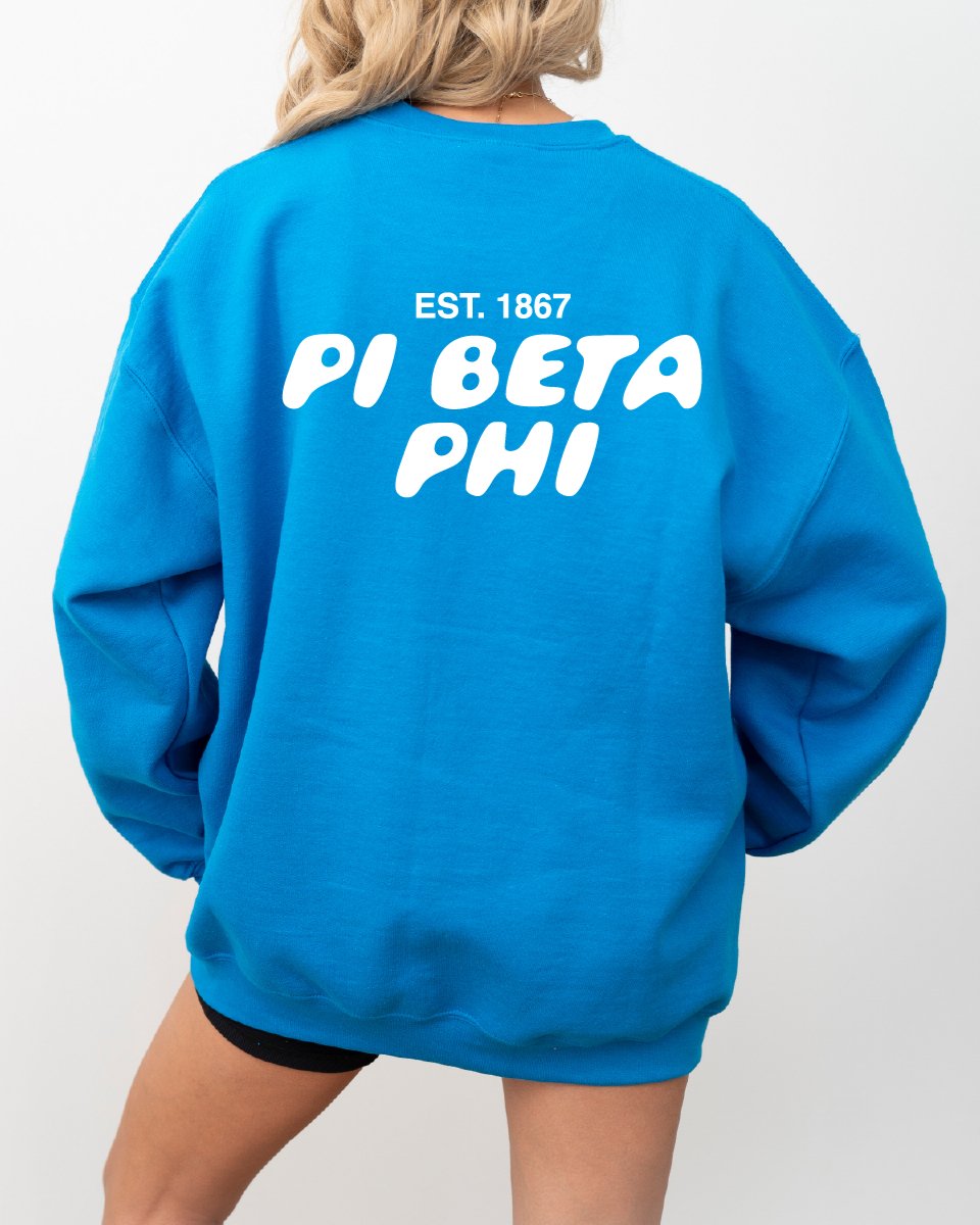 Soft, cute, and trendy, this Pi Beta Phi Bubble Text sorority crewneck will quickly become your go-to cozy sweatshirt! Use the drop down to specify preference between black, sport grey, pink, sapphire blue, charcoal, royal blue, carolina blue, or cardinal red.