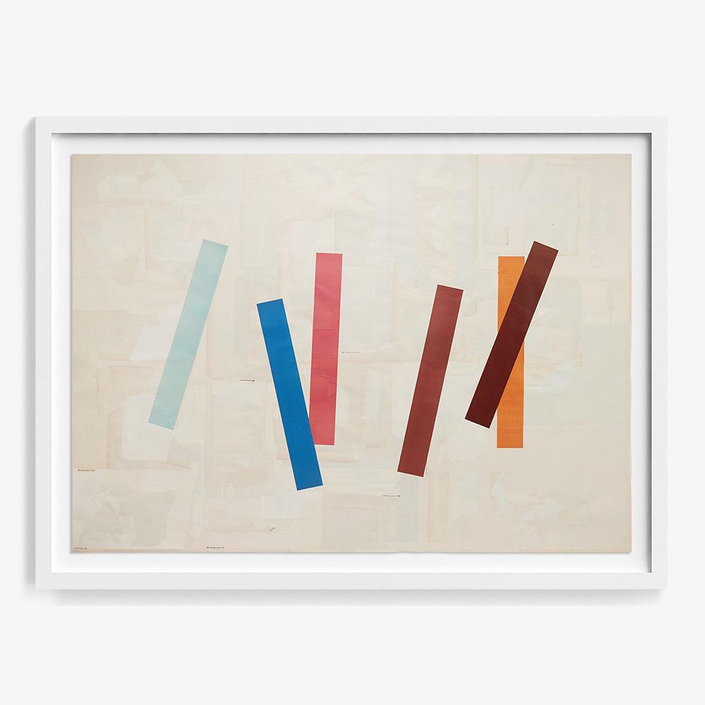 Inspired by his late grandfather’s love of music and charting market growth, Michael DeSutter created “Counting Bars.” The collage series takes cues from business graphs and bar charts, reimagining them as visual representations of personal growth. Over a six month period, DeSutter worked with eighteen years’ worth of Fortune Magazines inherited from his grandfather. While sifting through the publications dating from 1954 to 1972, he took clippings of various bars of color and organized them into groupings. To create each collage, DeSutter fanned a set of color bars and allowed them to fall organically onto a paper ground. He used the established locations to inform the final compositions, instilling a sense of movement.