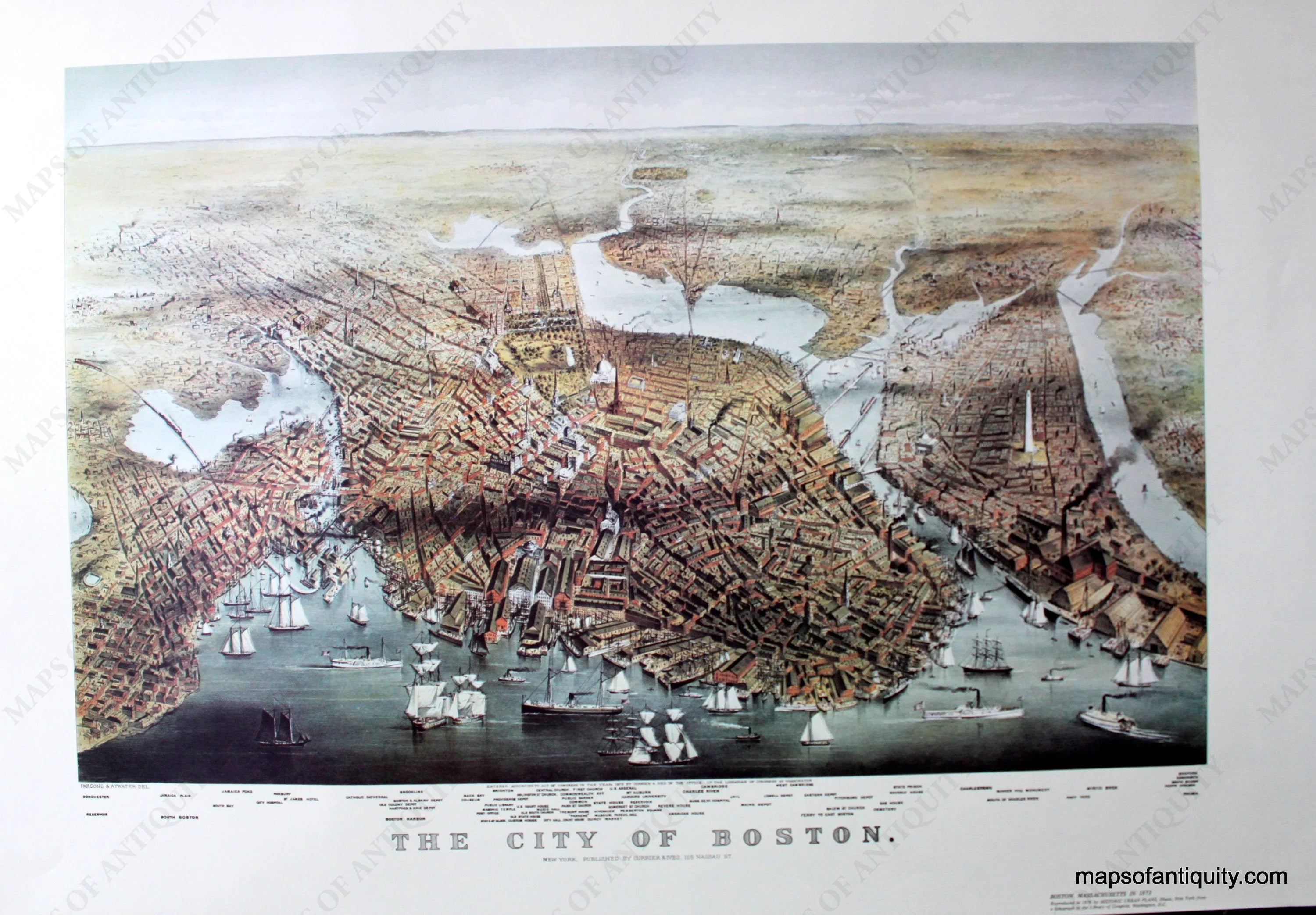 Reproduction print of 1873 Currier & Ives Colored Bird’s Eye View of Boston on lightweight paper, 20 x 30. Measured to the edges of the printed area. Paper may be larger but can be trimmed as needed. Smaller size available.