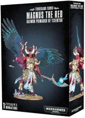 The air screams as Magnus the Red descends from the skies, and stone runs molten beneath his shadow. Cyclopean son of the Emperor of Mankind, his very presence is anathema to logic. To look upon him is to surrender sanity, and when the Crimson King gazes back, destruction is loosed in unimaginable measure. Second only to the Emperor in terms of psychic ability, he rends asunder reality with a sweep of his blade, annihilating even super-heavy vehicles with the sheer intensity of his ire. Then, with a flex of mighty pinions, Magnus the Red is borne aloft, glorying in his unnatural power as he brings fresh calamity to the weaklings who oppose him. This multi-part plastic kit contains the components necessary to assemble Magnus the Red, Daemon Primarch of Tzeentch. An imposing winged model whose size is appropriate to his power, he comes with a selection of 3 different faces (cyclopean, open helm and closed helm), is clad in armour dating from before the dark days of the Horus Heresy and has an array of modelling options: accessories include magical tomes, scrolls and daggers. Heâs armed with the frankly ostentatious Blade of Magnus, modelled as a choice of glaive or sword. Supplied with a Citadel 100mm Round based, and a crushed Space Wolf Dreadnought for a base detail!