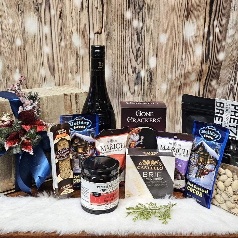 Arranged in Italian gift box with Christmas blue satin ribbons, ornament and compliment card.