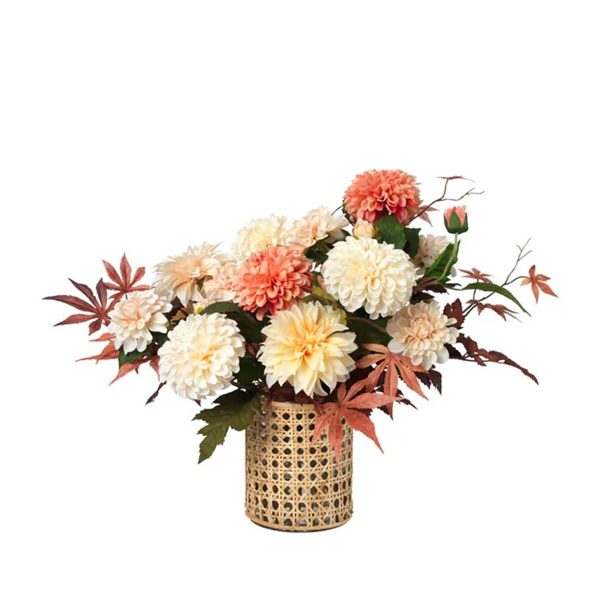Romantic fall florals get a stylih flair from the geometric caning that covers the glass vase. Place this understated, yet elegant, bouquet of faux dahlias, cimicifuga racemosa leaves and maple branches on a console for all to admire throughout the season.